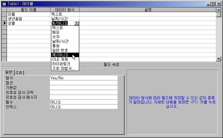 ¨ê ´ÙÀ½ ÇàÀÇ Çʵå À̸§À¸·Î '¼ºº°'À» ÀÔ·ÂÇÏ°í µ¥ÀÌÅÍ Çü½ÄÀ¸·Î´Â [¿¹/¾Æ´Ï¿À]¸¦ ¼±ÅÃÇÕ´Ï´Ù. ³²ÀÚÀÎÁö ¿©ÀÚÀÎÁö µÑ Áß¿¡ Çϳª¸¸ ¼±ÅÃÇÒ ¼ö ÀÖÀ¸¹Ç·Î [¿¹/¾Æ´Ï¿À] Çü½ÄÀ» »ç¿ëÇÏÁö¸¸ ¾î¶² °æ¿ì¿¡´Â ÅØ½ºÆ® Çü½ÄÀ¸·Î ¼³Á¤ÇÑ ÈÄ¿¡ ¹®ÀÚ·Î Ãë±ÞÇØ¼ ¾²±âµµ ÇÕ´Ï´Ù.